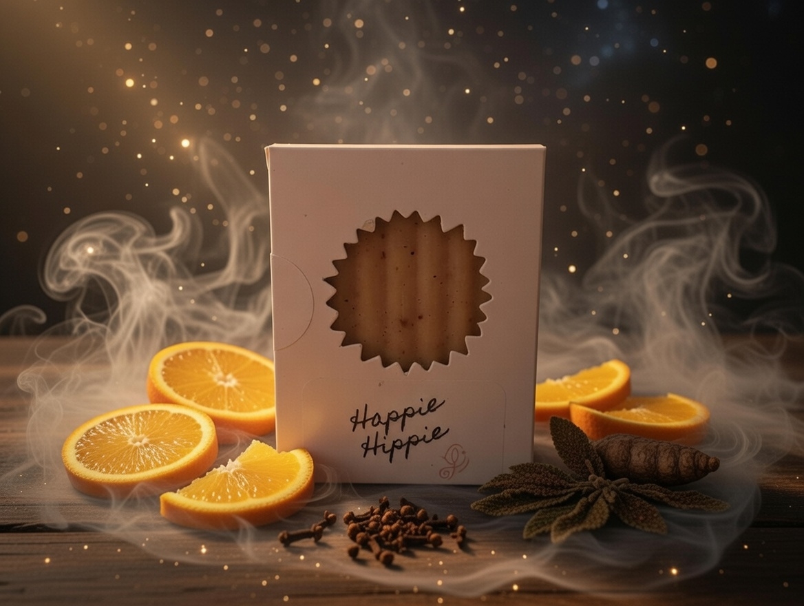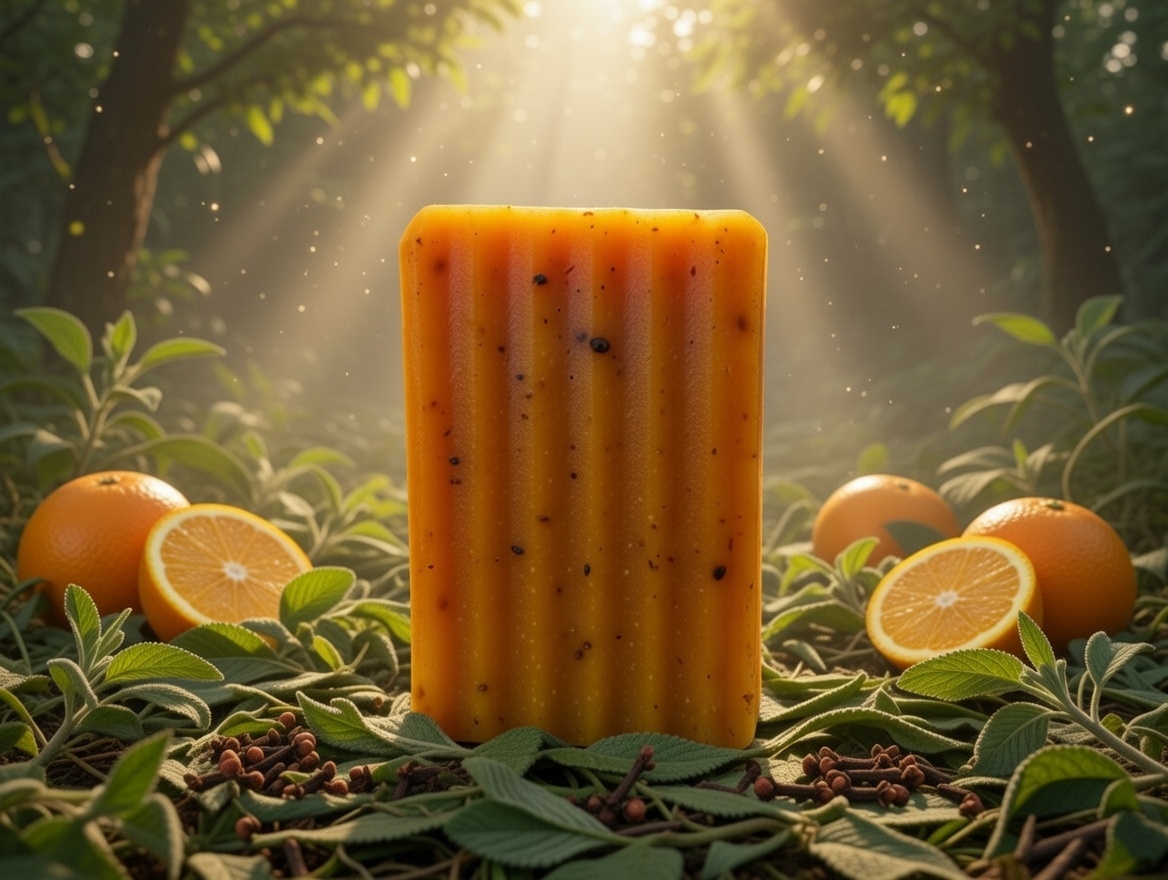 Vegan soap with sunny orange, patchouli & clove — bright, uplifting, joyful.