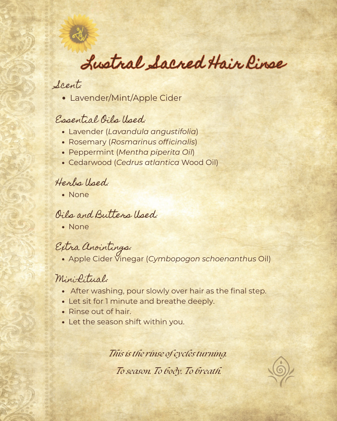 Handmade with pure essential oils (lavender, rosemary, peppermint, cedarwood) and natural ingredients, this rinse is crafted to balance the scalp, remove buildup, and restore shine while inviting the body to remember the turning of seasons. Light in colour, with a fresh, herbaceous aroma that opens the mind and grounds the spirit.