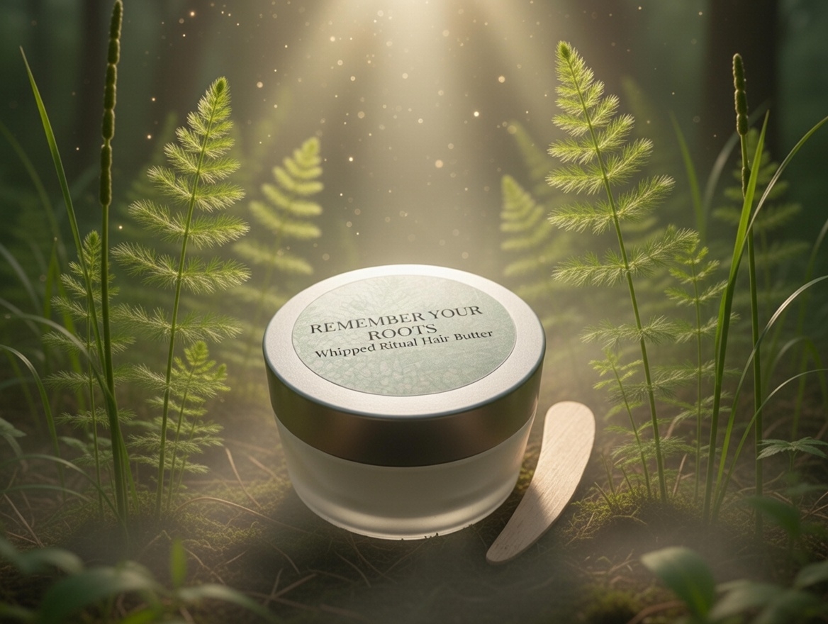 A grounding, nourishing hair butter that calls your strands back to their resilient essence — a ritual of remembrance and strength, blending jojoba, sweet almond, and castor oils infused with horsetail for vitality, shea and mango butters for softness, arrowroot for smoothness, vitamin E for protection, and an essential oil blend for a fresh, earthy aroma that evokes ancient forests and forgotten wisdom.