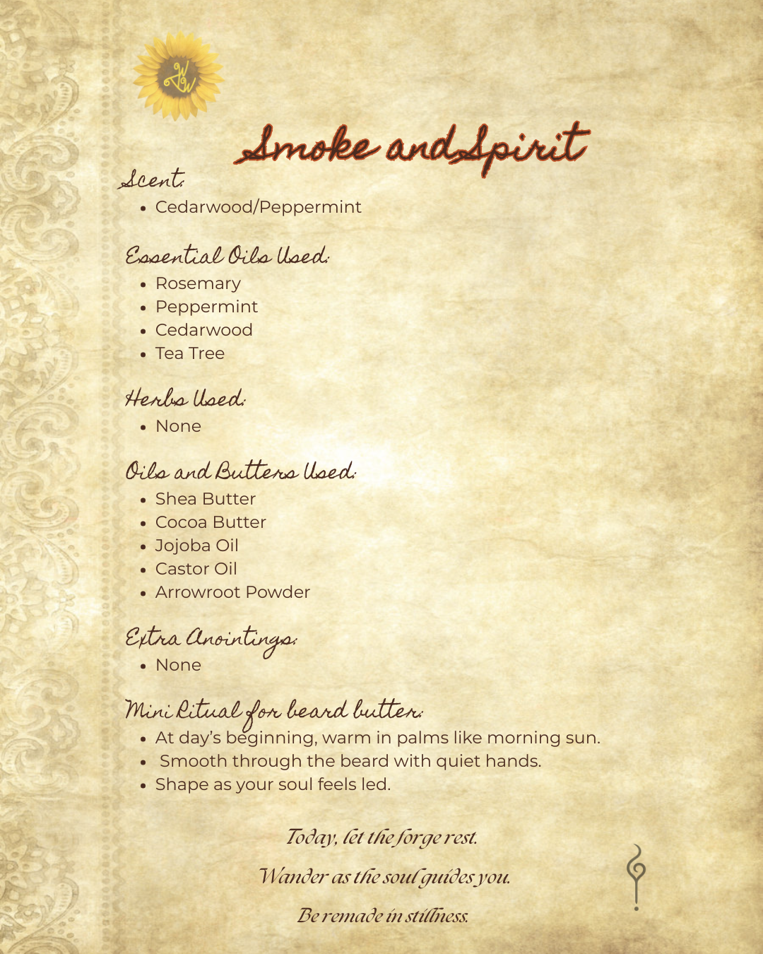 Handmade in small batches with pure shea, cocoa, jojoba, castor, and arrowroot, infused with cedarwood, peppermint, rosemary, and lavender for a warm, woody scent that grounds the spirit and awakens presence. Natural beige colour, creamy texture, and a subtle, smoky aroma that says “I carry fire, and I carry stillness.”