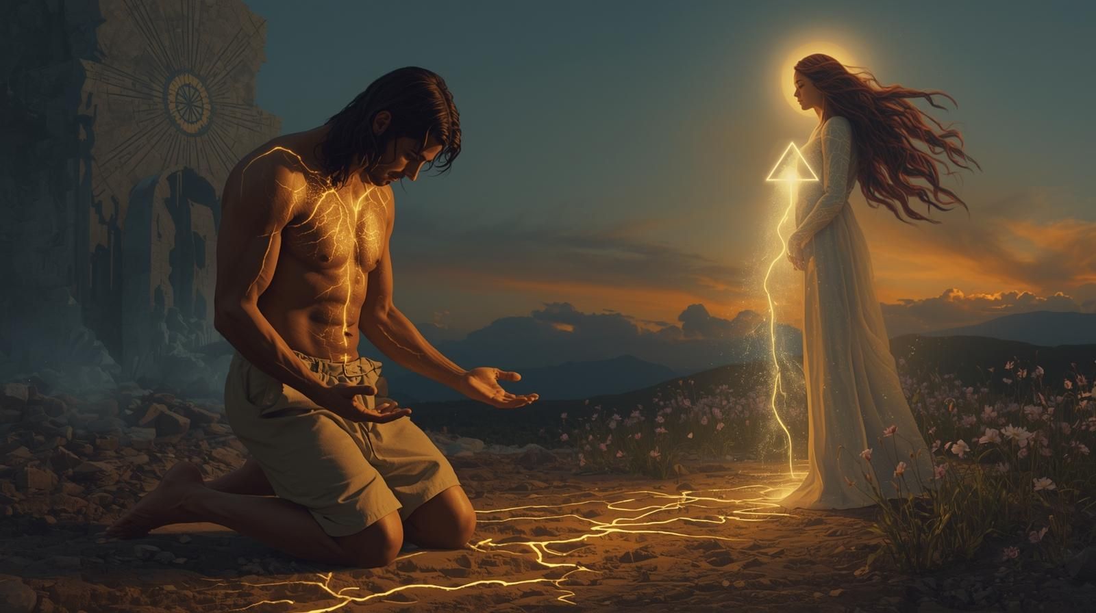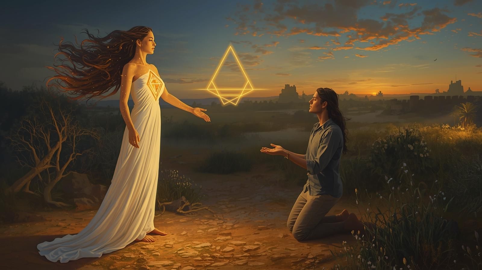 Two such souls meet gaze-to-gaze: tetrahedrons interlock, Merkaba ignites, love becomes world-creating force.
